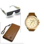 Elevate your look with this 3-in-1 men’s set: gold-dial watch (brown strap), premium brown wallet & white sunglasses. Stylish, affordable & perfect for gifting!