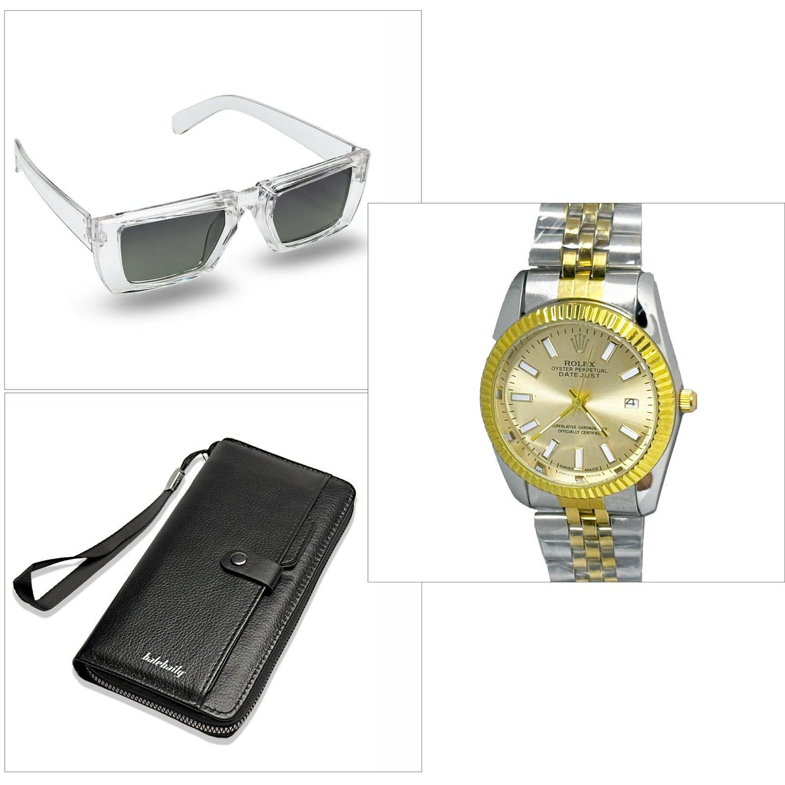 Stylish 3-in-1 combo: silver & gold watch, black leather wallet, and white sunglasses — all at a budget-friendly price. Perfect for daily use or gifting!