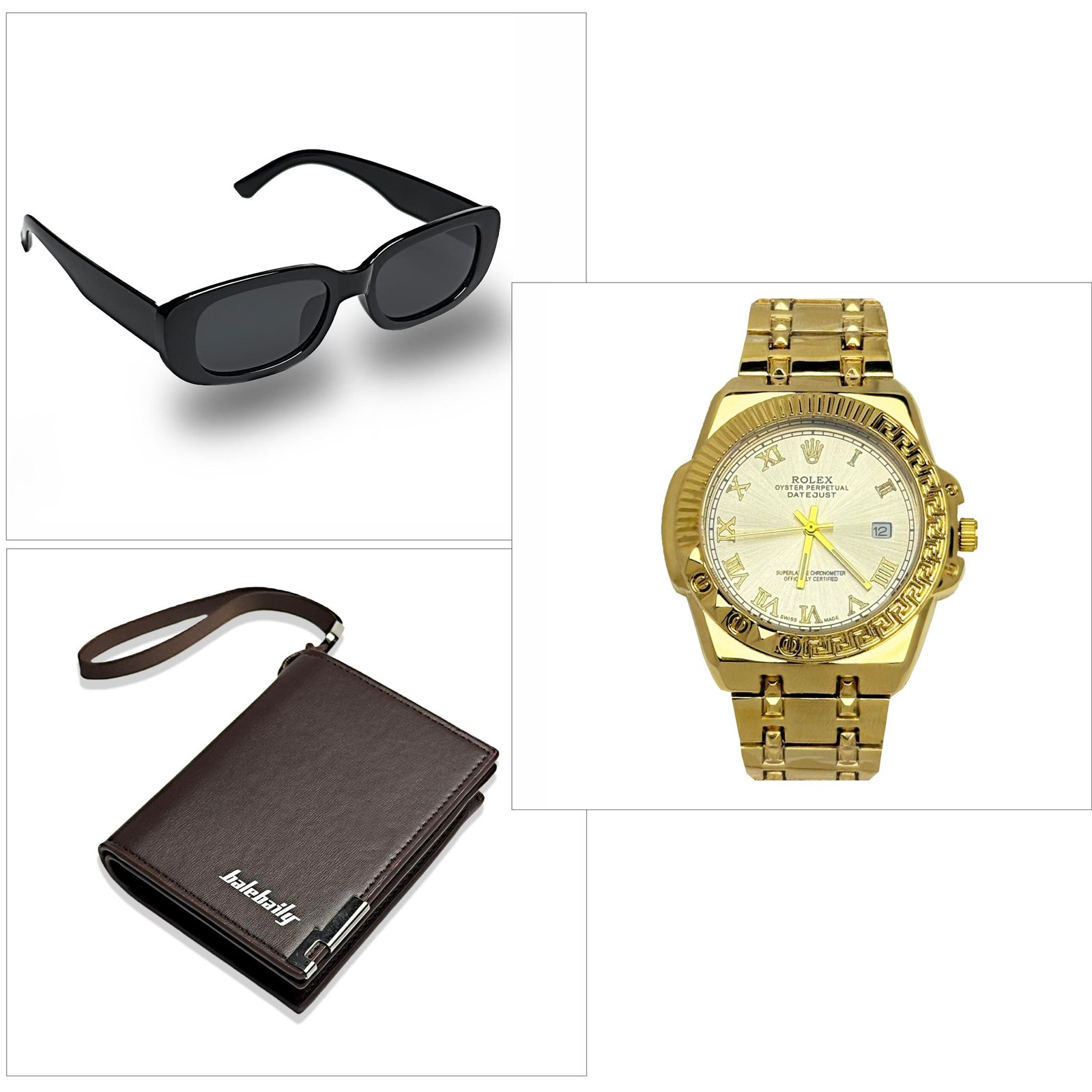 Upgrade your style with this best-selling 3-in-1 men’s combo! Includes a classy gold watch, premium leather wallet, and bold black sunglasses — all at an unbeatable price. Perfect for daily use or gifting!