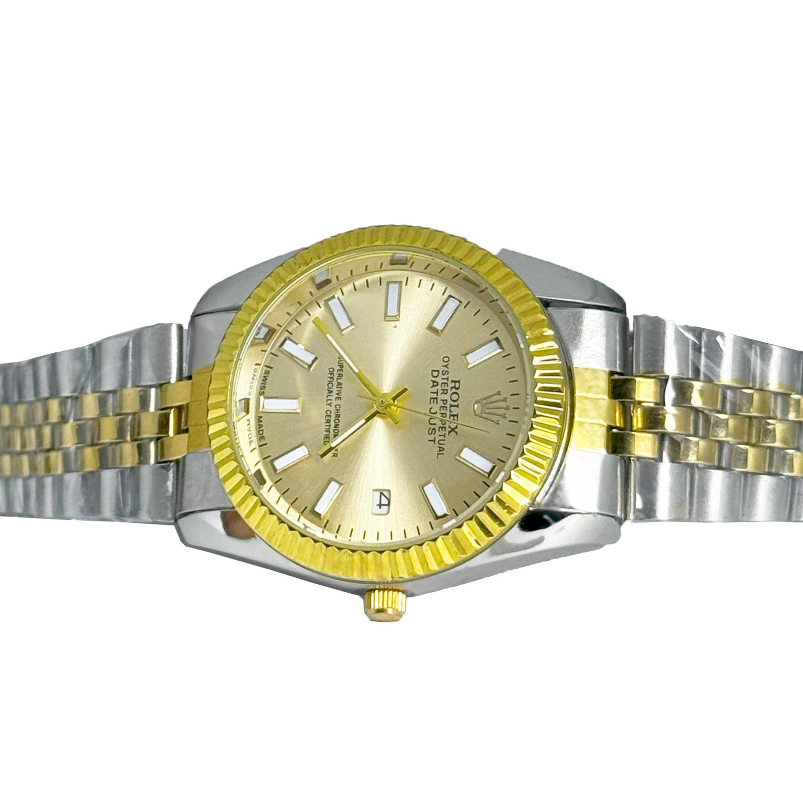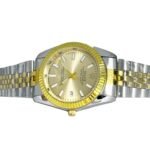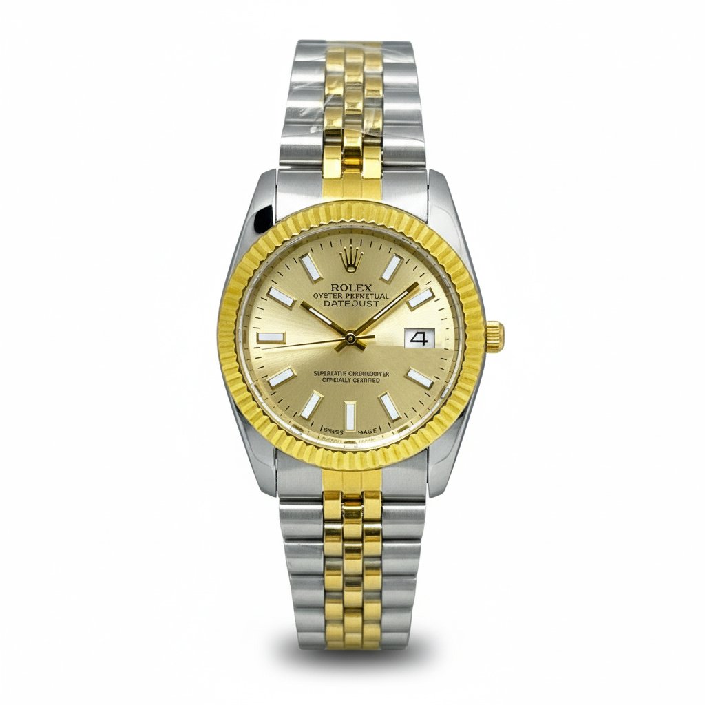 A premium two-tone wrist watch with a stainless steel strap, golden bezel, and champagne dial. Perfect for formal, casual, and luxury occasions.