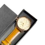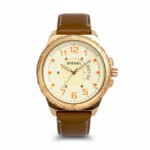 Majestic Gold: Brown Leather Prestige – A timeless masterpiece featuring a luxurious gold dial paired with a rich dark brown leather strap. Crafted for those who appreciate classic elegance and refined style.