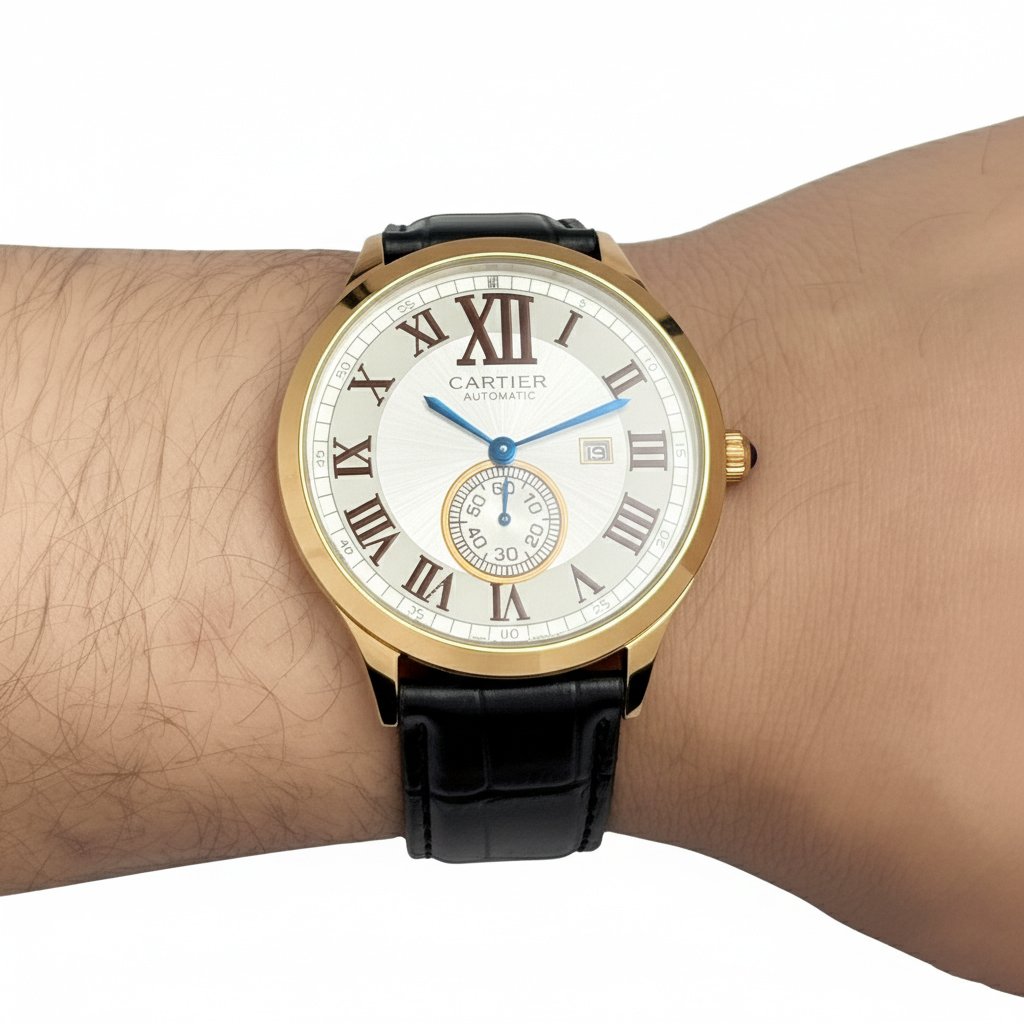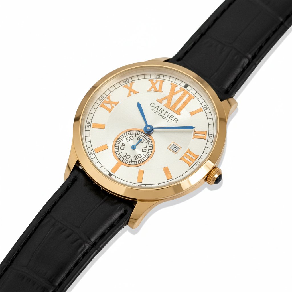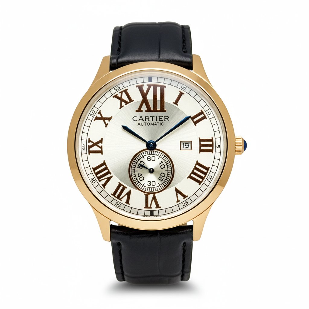 This watch is a celebration of classic watchmaking, capturing the timeless prestige of high-end Swiss design, reminiscent of legendary manufacturers like Cartier. The polished gold-tone finish and intricate dial details ensure a luxurious presence on the wrist, making it an essential accessory for formal events, business meetings, or any time you want to make a statement of refined taste.