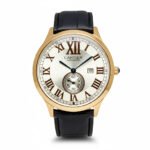 A luxurious, classic timepiece featuring an elegant gold-tone case, a refined white dial with oversized Roman numerals, and a practical small seconds sub-dial. Paired with a premium black leather strap, this watch is the definition of formal sophistication.