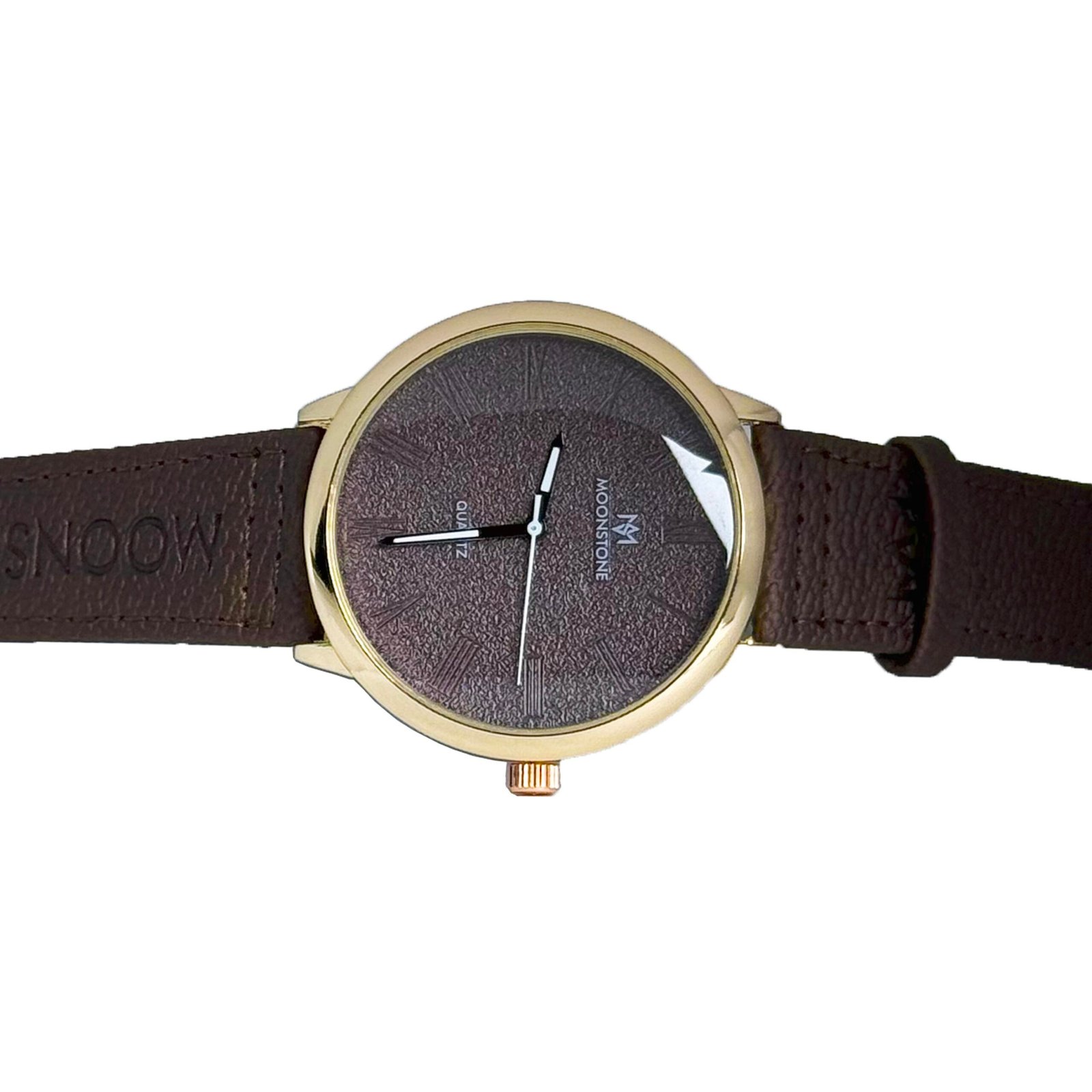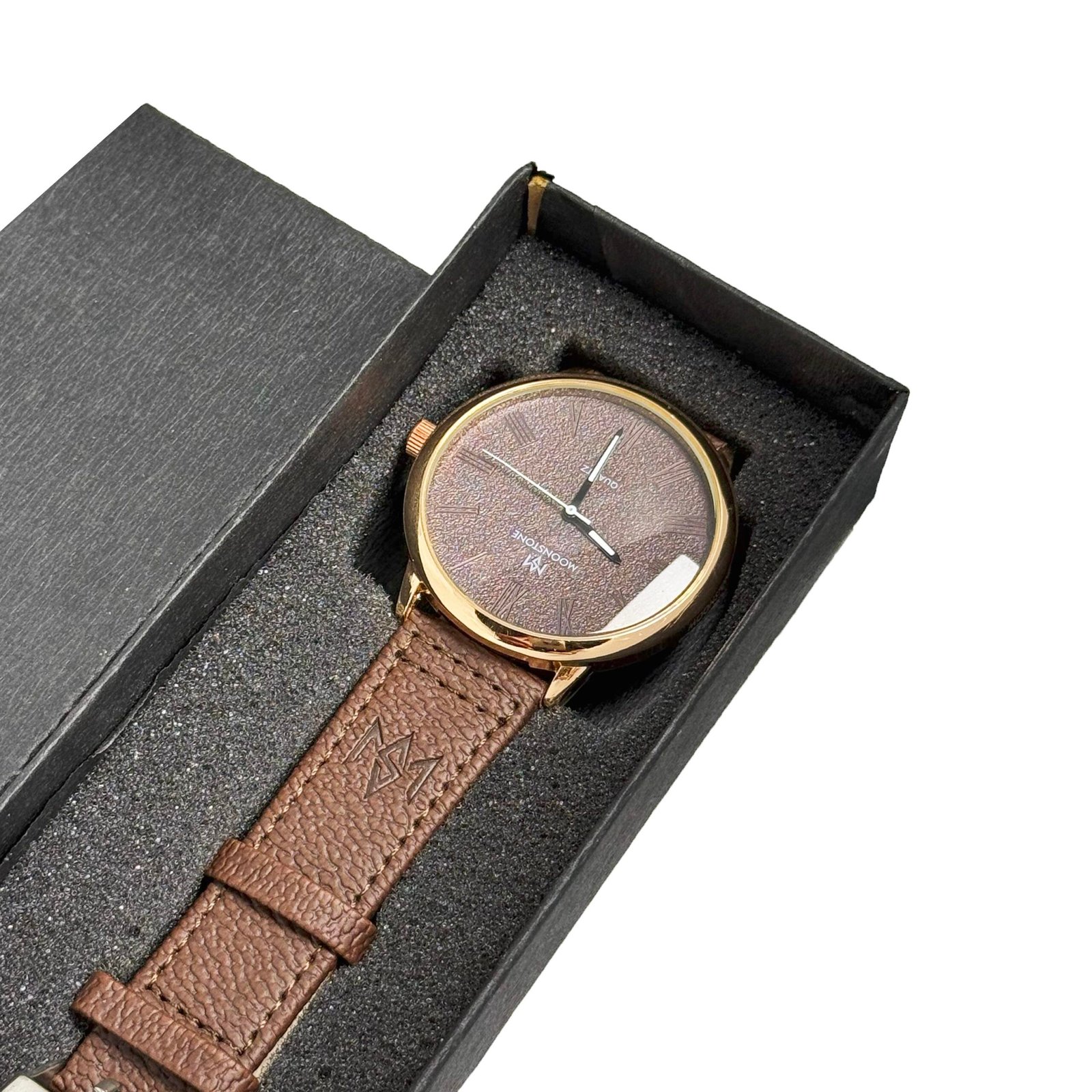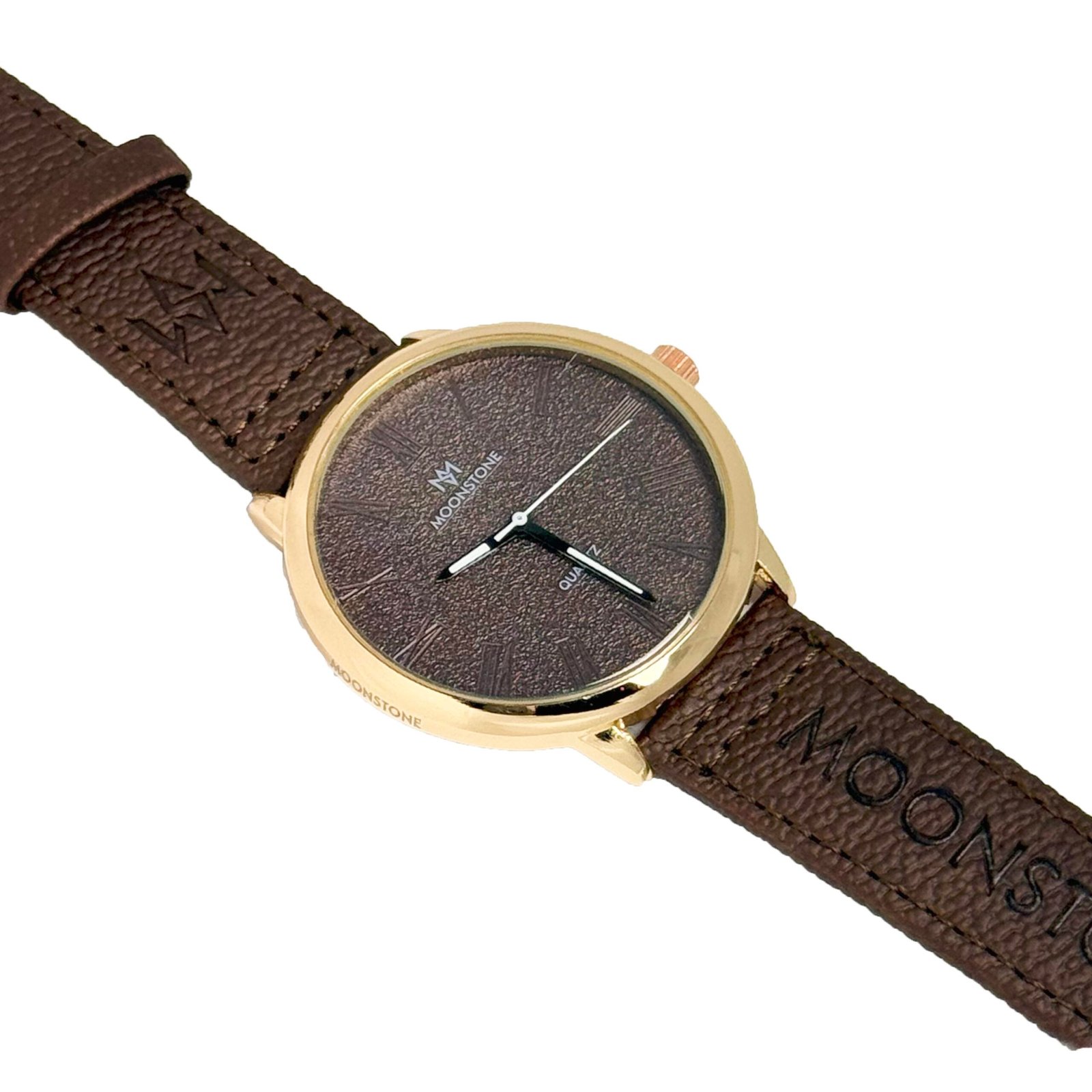 - Strap: High-quality brown leather strap featuring the MOONSTONE logo detail.