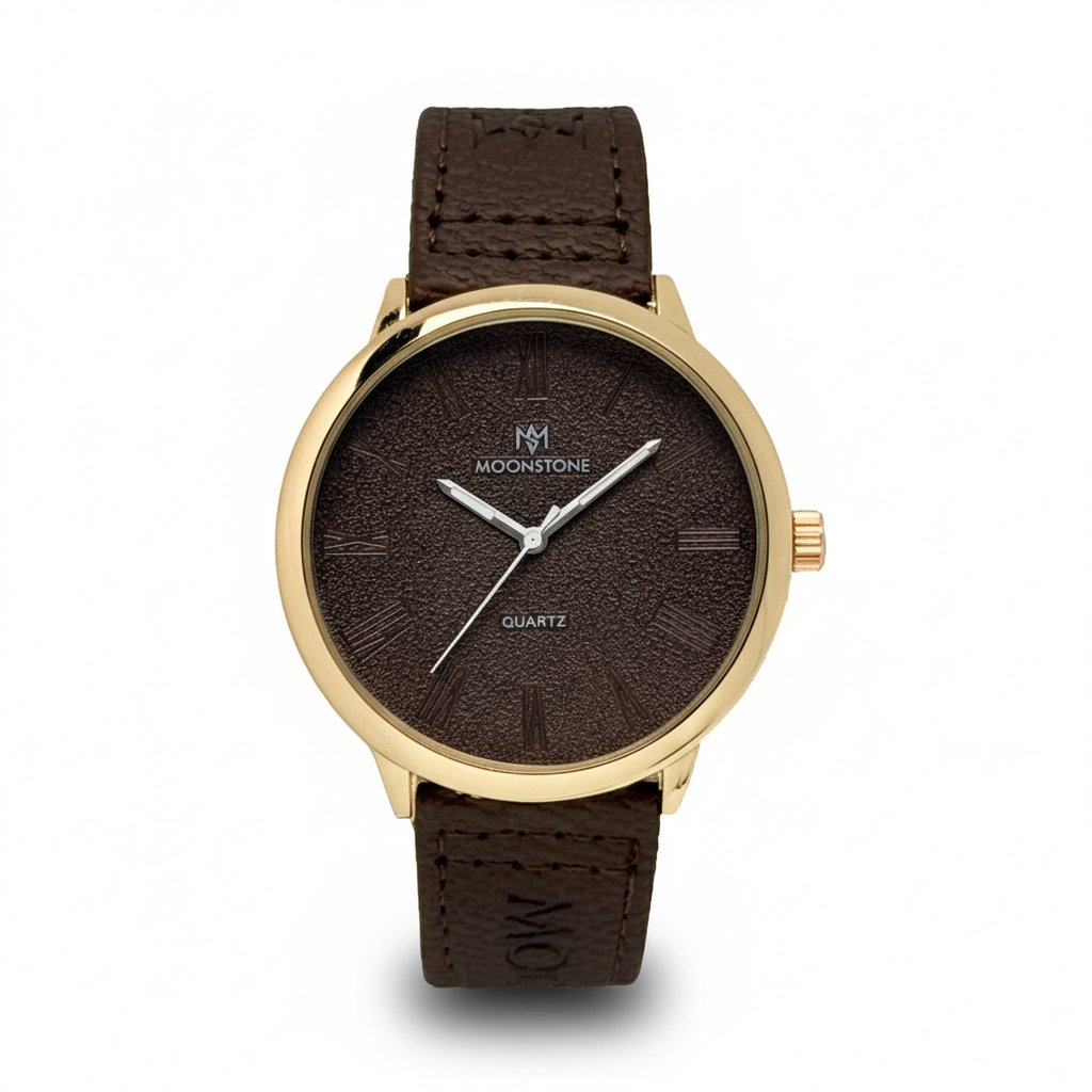 A beautiful blend of classic and modern. This MOONSTONE watch features a polished gold-tone case, a unique textured dark brown dial with Roman numerals, and a comfortable brown leather strap. An elegant gold brown leather watch perfect for daily sophistication.